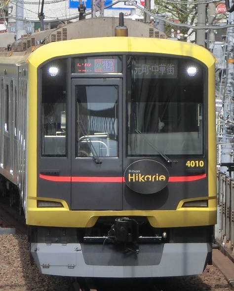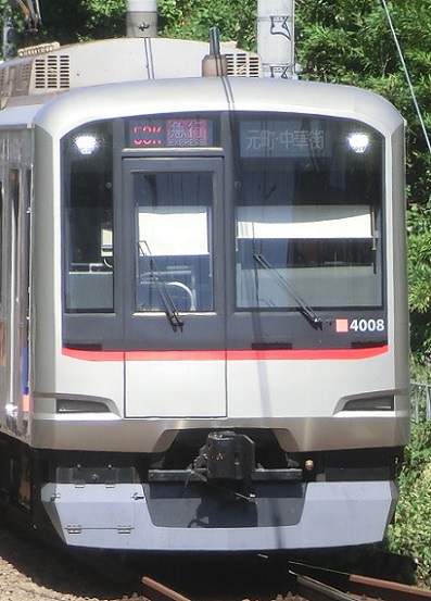 東横線5050系の10両編成。副都心線直通用に製造された車両で、主に特急や急行などの優等運用に就いている。6、7号車を抜いて8両編成として運用することも可能となっており、その場合は各駅停車などに使用される。