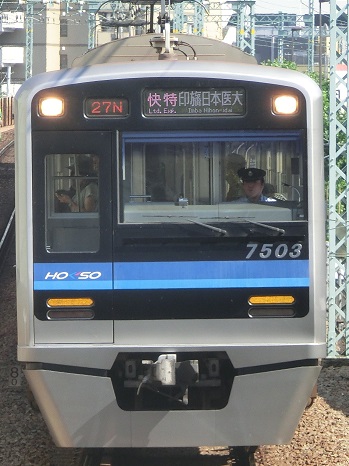 同じく北総7500系。京成新3000系の色違いである。2006年に登場し、VVVF-IGBTを使用したり環境に配慮しながらも、先頭車に車椅子スペースを設けるなど、人にも優しい車両となっている。この編成含めて3本在籍。